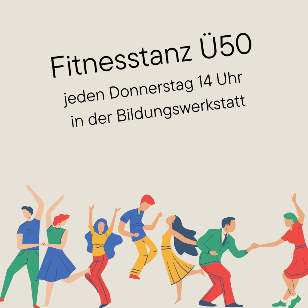 Das Bewegungsangebot für Menschen ab 50 Jahren findet jeden Donnerstag von 14 – 14:30 Uhr in der Bildungswerkstatt statt. Es geht dabei vor allem um eines: mit Musik in Bewegung bleiben. Nach einer kurzen Aufwärmphase werden einfache Bewegungselemente geübt und zu einem Tanz zusammengesetzt.